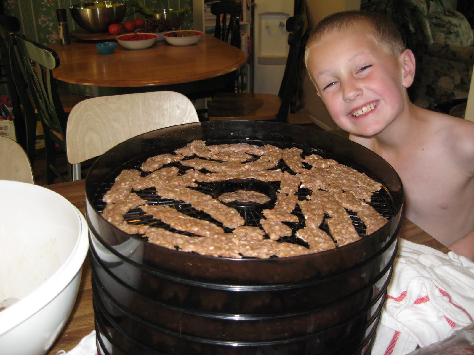 We are getting ready for summer. Making everyone's favorite beef jerky. Zach didn't want to help and an even bigger surprise is that he didn't want to pose for pictures. Jacob loves to help out in the kitchen though so he came to help and wanted pictures. We use ground beef for our jerky and shape it with a gun so here we are just after the spices had been mixed into the meat. Jacob couldn't wait to use the gun. Unfortunately he wasn't quite strong enough to pull the trigger so I ended up using it for him.